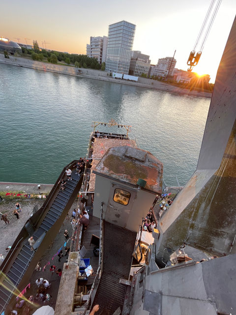 Der Hafenkran kann für Events gemietet werden. Die obere Plattform beeindruckt mit einem atemberaubenden Panoramablick mit Sonnenuntergang über den Rhein und der Stadt Basel. Diese Plattform eignet sich perfekt für bis zu 100 Personen. Der untere Bereich bietet viel Platz für verschiedenste Veranstaltungsformate. Hier können grössere Gruppen gemütlich zusammenkommen, sei es für eine festliche Hochzeitsfeier oder ein lebendiges Apéro.
